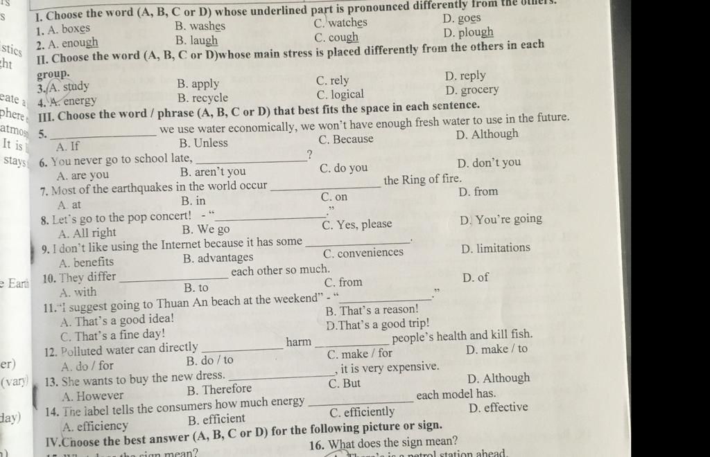I. Chọn từ có phát âm khác so với các từ còn lại