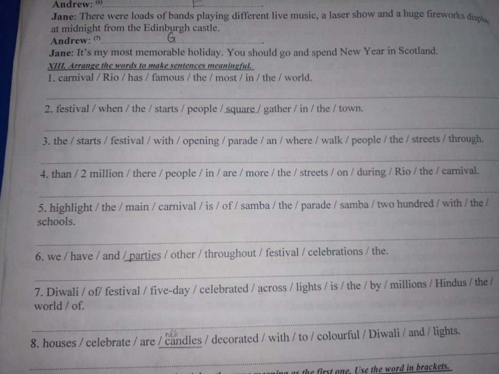 8. houses / celebrate / are / candles/ decorated/with/to / colourful /Diwali / and / lights. ming as the first one. Use the word in brackets