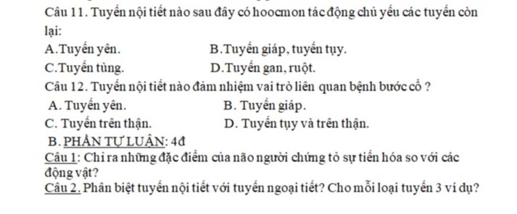 Câu 2:Tuyến nội tiết VD:tuyến yên ,tuyến giáp,tuyến tụy