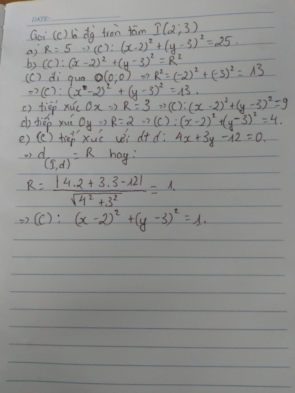 Trong mặt phẳng Oxy hãy lập phương trình của đường tròn (C) có tâm là điểm (2;3) và thõa mãn điều kiện sau :