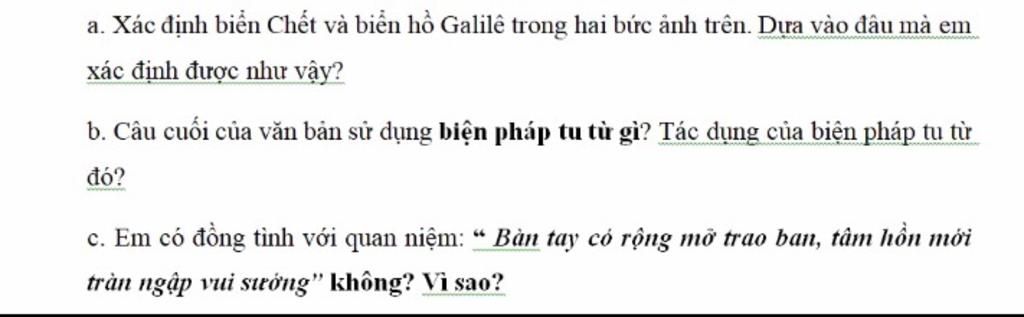 a) Biển Chết và biển hồ Galilê ở trong đoạn văn trên ở Palextin. Em dựa vào câu văn đầu tiên để trả lời.