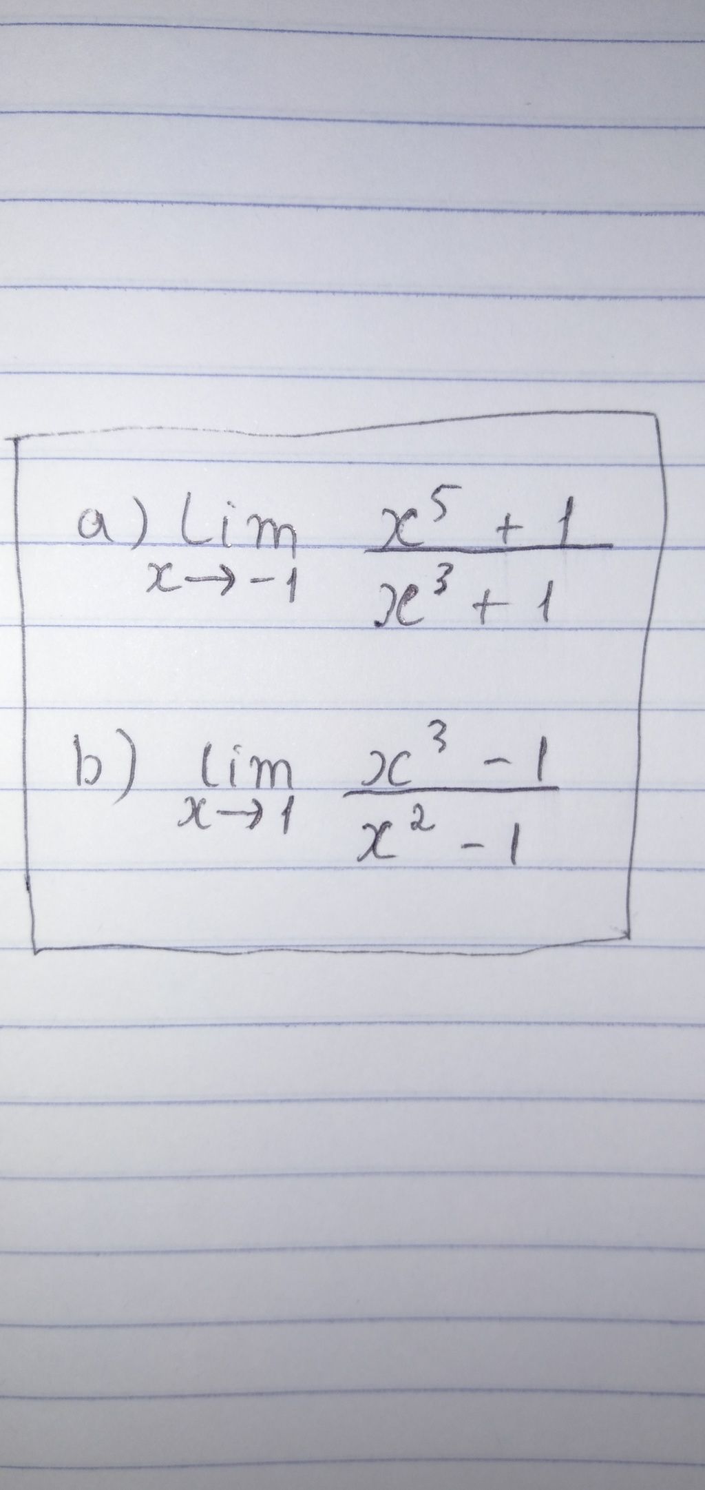 a) $\displaystyle\lim_{x \to -1} \dfrac{x^5+1}{x^3+1} = \dfrac{5}{3}$