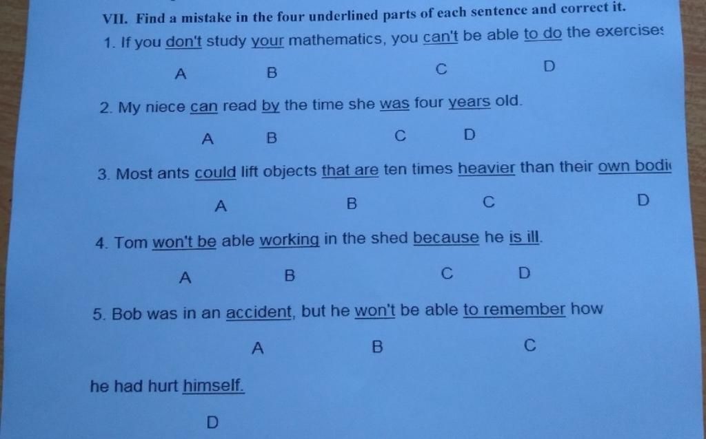 VII. Find a mistake in the four underlined parts of each sentence and correct it.