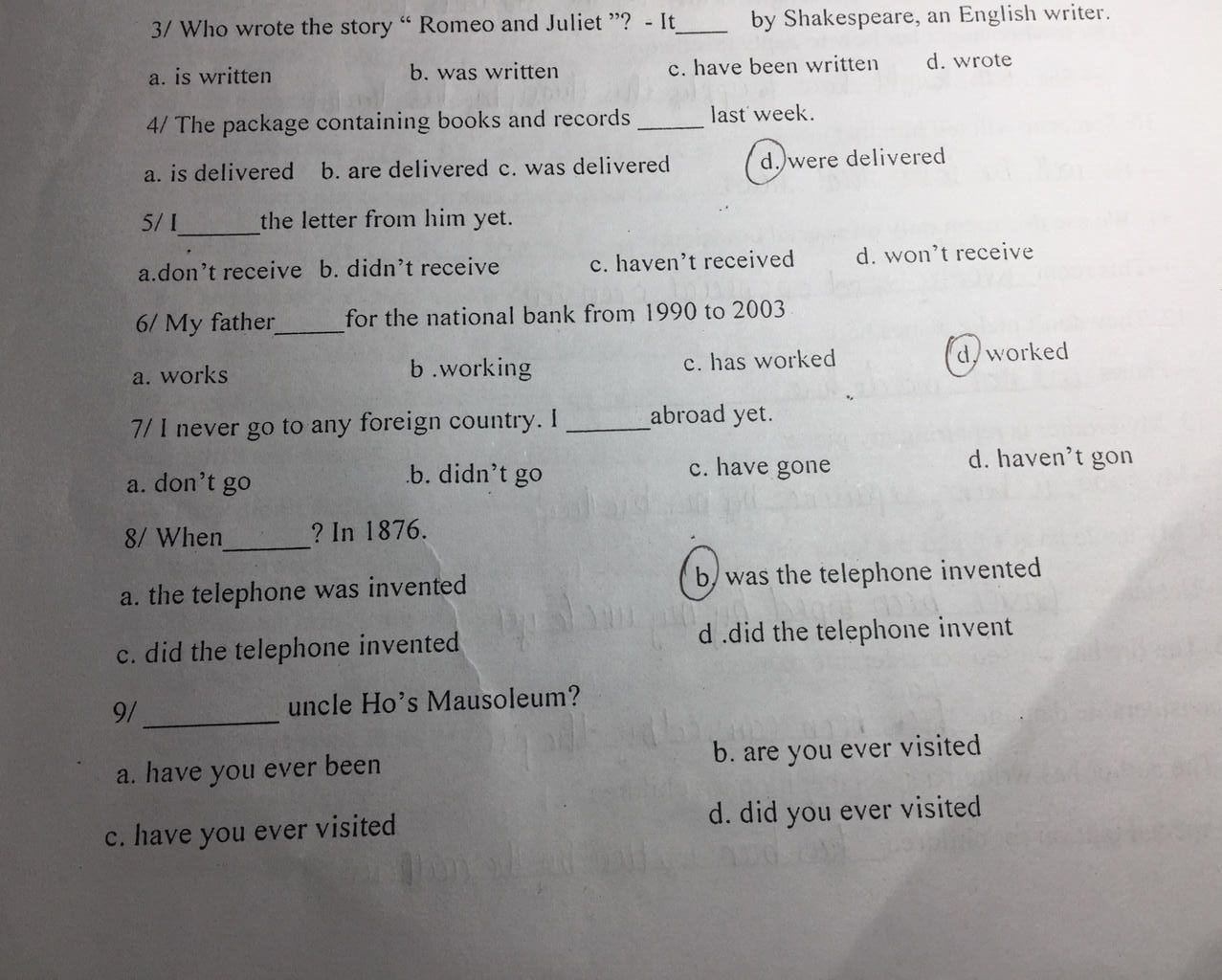 3. b (câu hỏi ở thì QKĐ -> trả lời bằng thì QKĐ, đây là câu bị động)