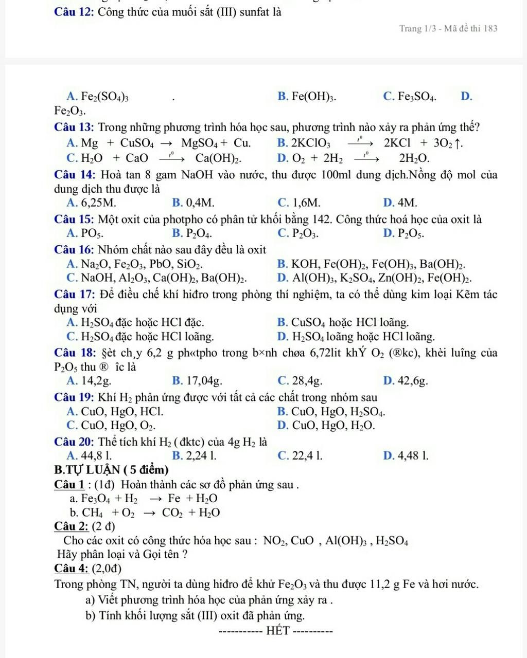 PTHH : Fe2O3 +3H2 → 2Fe +3H2O