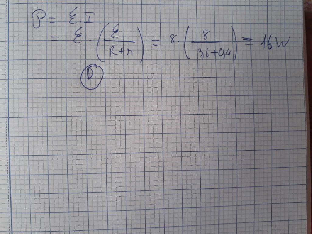 $P=\xi.I=\xi.\dfrac{\xi}{R+r}=\dfrac{8^2}{3,6+0,4}=16W$