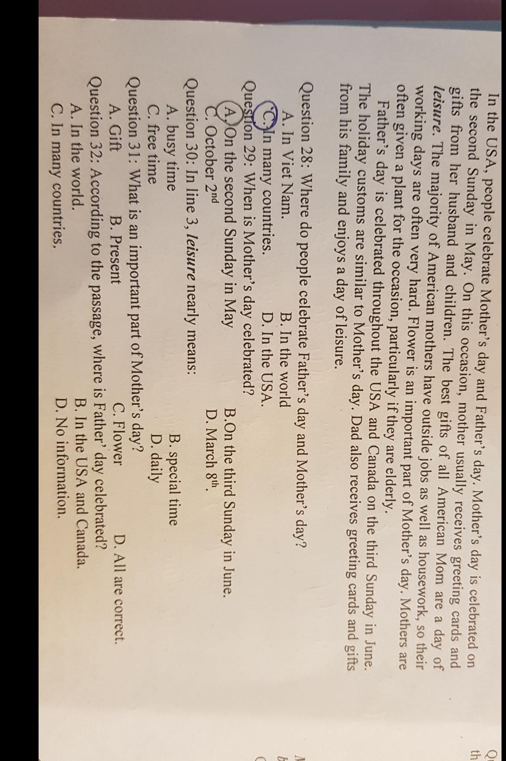 In the USA, people celebrate Mother's day and Father's day. Mother's day is celebrated on