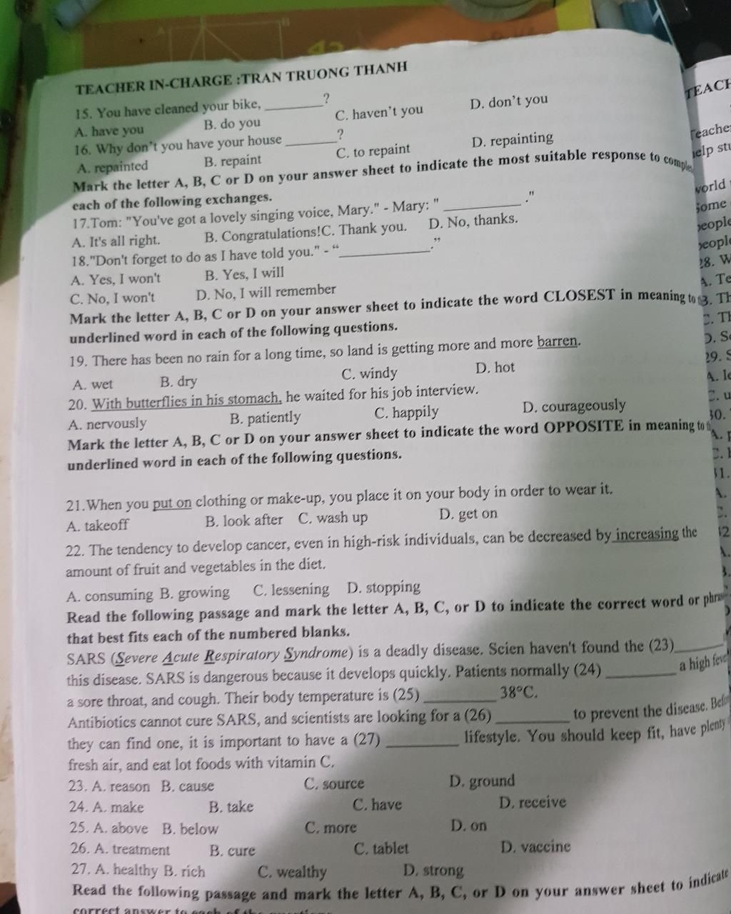 Mark the letter A, B, C or D on your answer sheet to indicate the most suitable response
