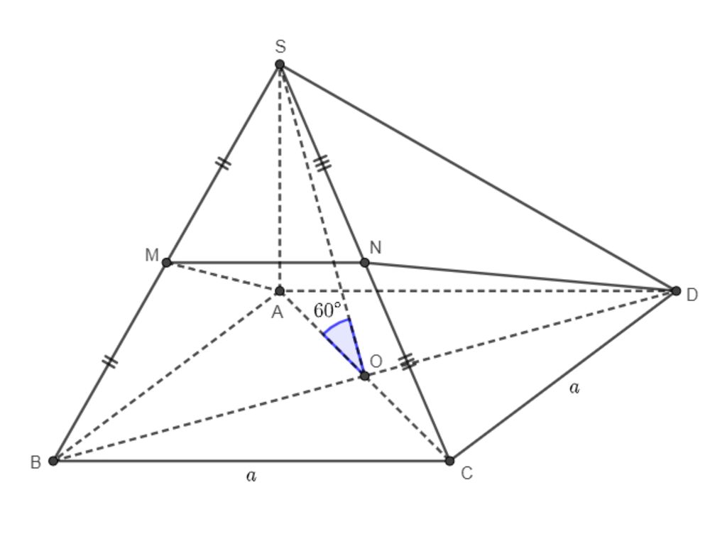 $\Rightarrow SA = OA.\tan60^\circ = \dfrac{a\sqrt2}{2}\cdot \sqrt3 = \dfrac{a\sqrt6}{2}$