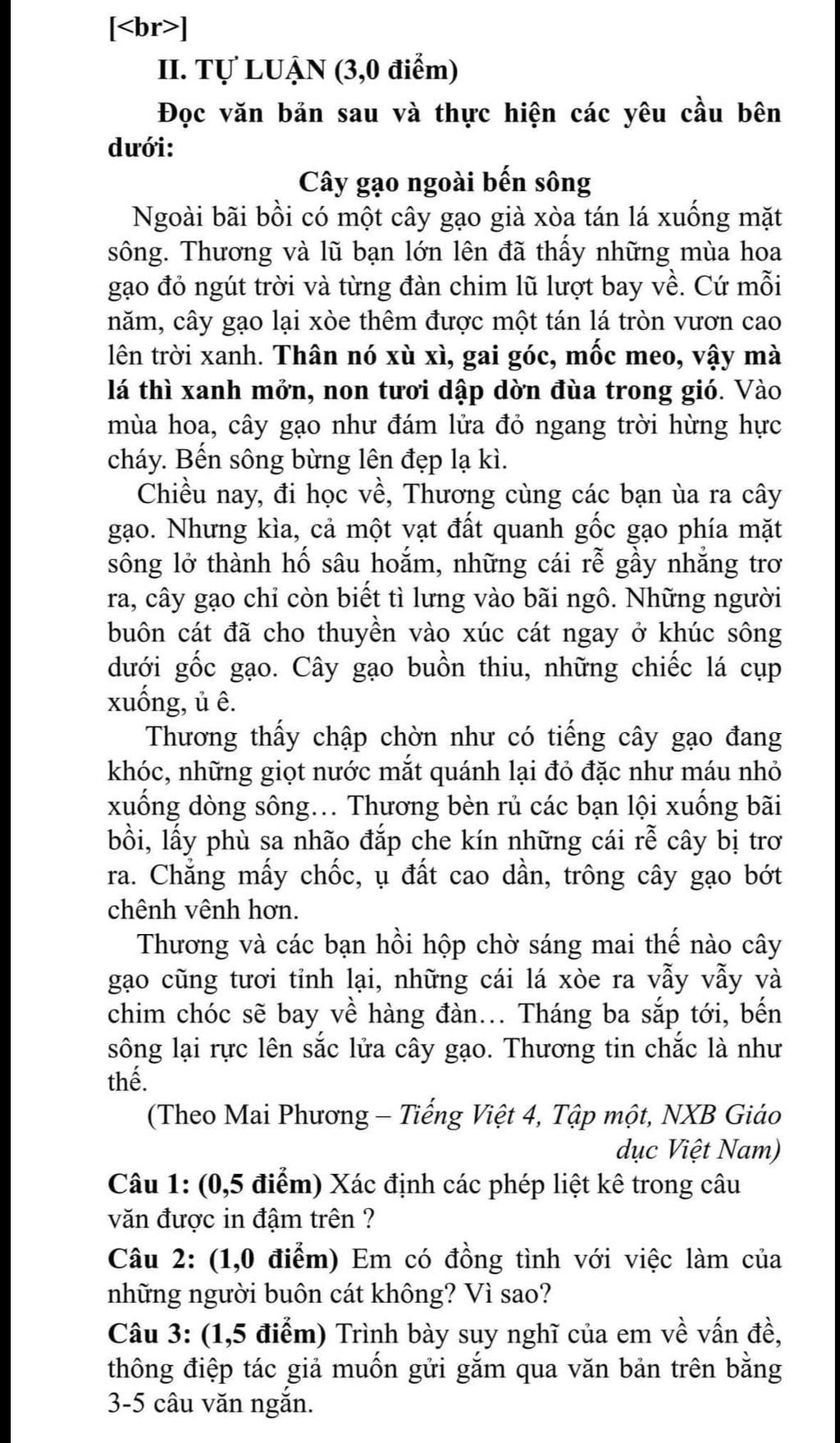 Qua văn bản trên tác giả muốn gửi gắm một thông điệp về việc hút cát trái phép khiến cho cây gạo cũng bị lún một phần rễ. Hành động này có thể dẫn đến sạt lở diện rộng, vào sâu trong đất liền. Thông điệp ý nghĩa này chính là đang nhắc nhở chúng ta không nên vì lợi ích cá nhân trước mắt mà không màng tới hậu quả sau này. Phải nói việc làm này ảnh hưởng tới đời sống, sinh hoạt của người dân sống gần khu vực cũng như mất đi các loài cây cổ thụ gần bờ sông.