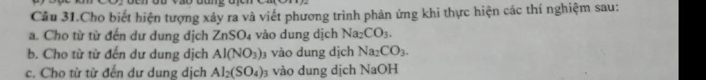 `a)` Dung dịch xuất hiện kết tủa trắng, kết tủa tăng dần tới cực đại. Khi `Na_2CO_3` trong `dd` hết, `ZnSO_4` dư thì kết tủa không tăng nữa.