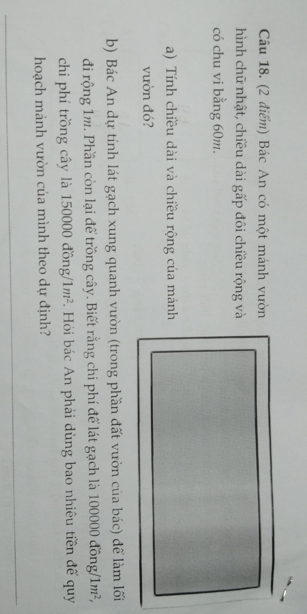 $\begin{array}{l}a)\ \text{Gọi $\begin{cases}\text{chiều dài mảnh vườn là $a$}\\\text{chiều rộng mảnh vườn là $b$}\end{cases}\quad(a,b\in\mathbb{N}^*; a>b)$}\\\text{- Theo đề bài ta có : $a=2b\quad(1)\\2(a+b)=60\to 2a+2b=60\quad(2)$}\\\text{- Thay (1) và (2) ta có :}\\\quad 2(2b)+2b=60\\\to4b+2b=60\\\to6b=60\\\to b=10\\\text{- Ta có : $a=2b\to a=2.10=20$}\\\text{- Vậy chiều dài mảnh vườn là 20m, chiều rộng là 10m.}\\\,\\b)\ \text{Diện tích mảnh vườn là :}\\\quad\rm 20\times10=200\ (m^2)\\\text{- Bác An mở rộng phần lối đi rộng 1m nên khi mở rộng ra 2 bên,}\\\text{chiều dài và chiều rộng phần trồng cây sẽ giảm đi 2m so với }\\\text{chiều dài, chiều rộng mảnh vườn ban đầu.}\\\text{- Chiều dài phần đất trồng cây là :}\\\quad\rm 20-2=18\ (m)\\\text{- Chiều rộng phần đất trồng cây là :}\\\quad\rm 10-2=8\ (m)\\\text{- Diện tích phần đất trồng cây là :}\\\quad\rm 18\times8=144\ (m^2)\\\text{- Chi phí trồng cây là :}\\\quad\rm 150\ 000\times144=21\ 600\ 000\ (đồng)\\\text{- Diện tích phần lối đi là :}\\\quad\rm200-144=56\ (m^2)\\\text{- Chi phí làm lối đi là :}\\\quad\rm 56\times100\ 000=5\ 600\ 000\ (đồng)\\\text{- Tổng chi phí bác An cần bỏ ra là :}\\\quad\rm 21\ 600\ 000+5\ 600\ 000=27\ 200\ 000\ (đồng) \end{array}$