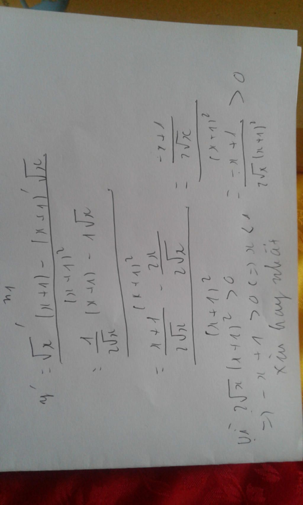 `= (x + 1 - 2x)/[2\sqrt{x}(x + 1)^2] = (1 - x)/[2\sqrt{x}(x + 1)^2] (ĐK : x > 0 (1))`