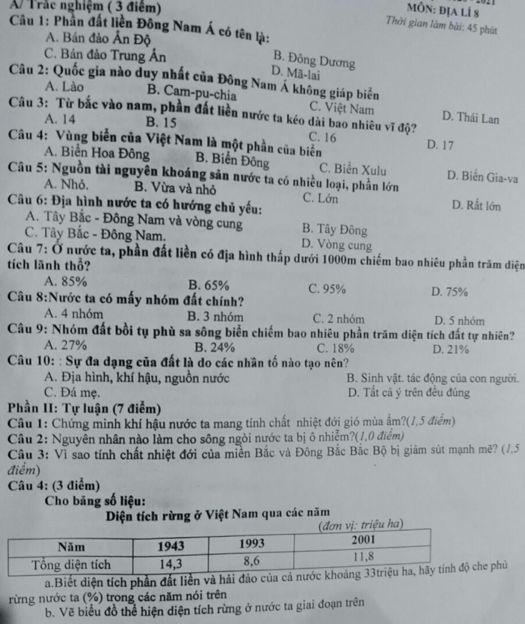 Câu 3: Từ bắc vào nam, phân đất liê ...