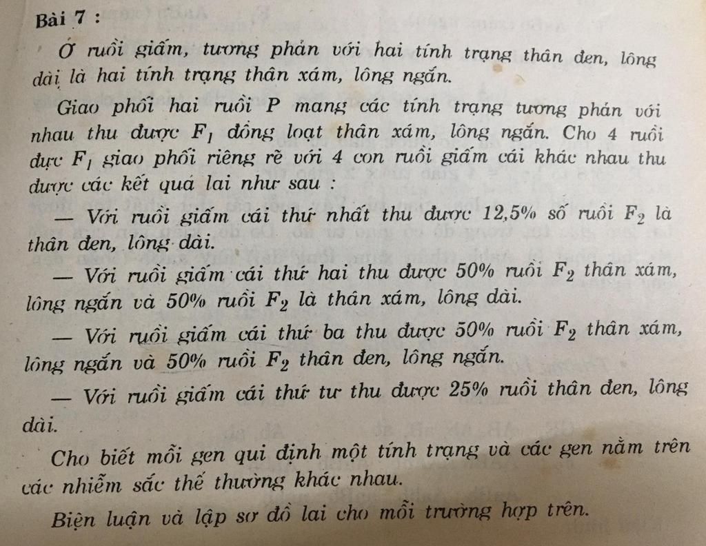 ruồi đực F1 lai với ruồi cái (I) thu được đời con có thân đen lông dài chiếm 12,5% ($\frac{1}{4}$ * $\frac{1}{2}$)