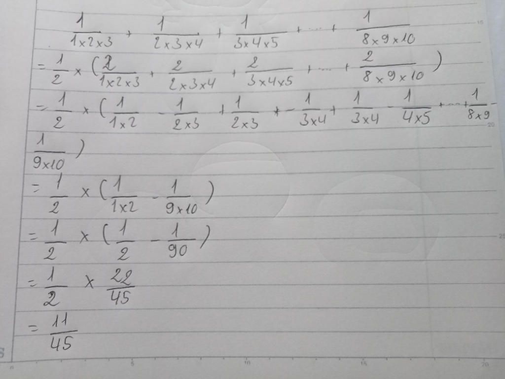 `1/ (1.2.3) + 1/ (2.3.4) + 1/ (3.4.5 )+ ... + 1/( 8.9.10)`