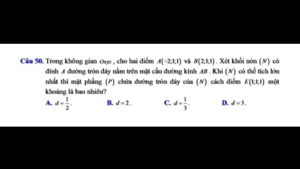 Câu 50. Trong không gian Oxyz , cho hai điểm 4(-2;1;1) và B(2;1;1). Xét khối nón (N) có