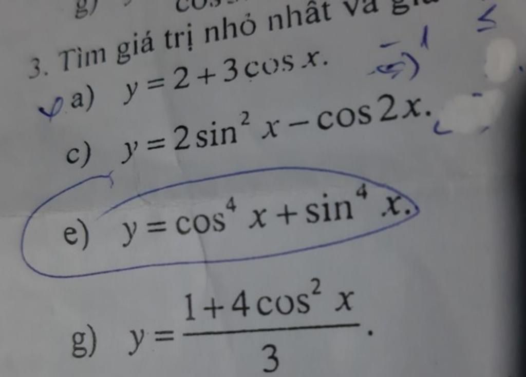 \[\begin{array}{l} c)\,\,y = 2{\sin ^2}x - \cos 2x = 2{\sin ^2}x - 1 + 2{\sin ^2}x = 4{\sin ^2}x - 1.\\ Ta\,\,co:\,\,\,0 \le {\sin ^2}x \le 1\\ \Rightarrow \,\,0 \le 4{\sin ^2}x \le 4\\ \Rightarrow \,\, - 1 \le 4{\sin ^2}x - 1 \le 3\\ \Rightarrow \left\{ \begin{array}{l} Min\,\,y = - 1\,\,\,\,\,khi\,\,\,\,{\sin ^2}x = 0\\ Max\,y = 3\,\,\,khi\,\,\,{\sin ^2}x = 1 \Leftrightarrow {\cos ^2}x = 0 \end{array} \right..\\ g)\,\,\,y = \frac{{1 + 4{{\cos }^2}x}}{3} = \,\frac{1}{3} + \frac{4}{3}{\cos ^2}x. \end{array}\] Đến đây em làm tiếp câu trên nhé em.