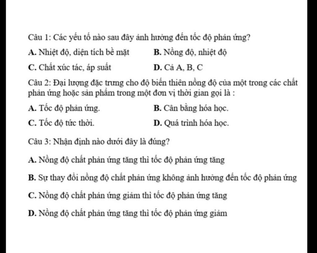 Nồng độ, nhiệt độ,nhiệt độ, diện tích bề mặt, chất xúc tác, áp suất đều ảnh hưởng đến tốc độ phản ứng