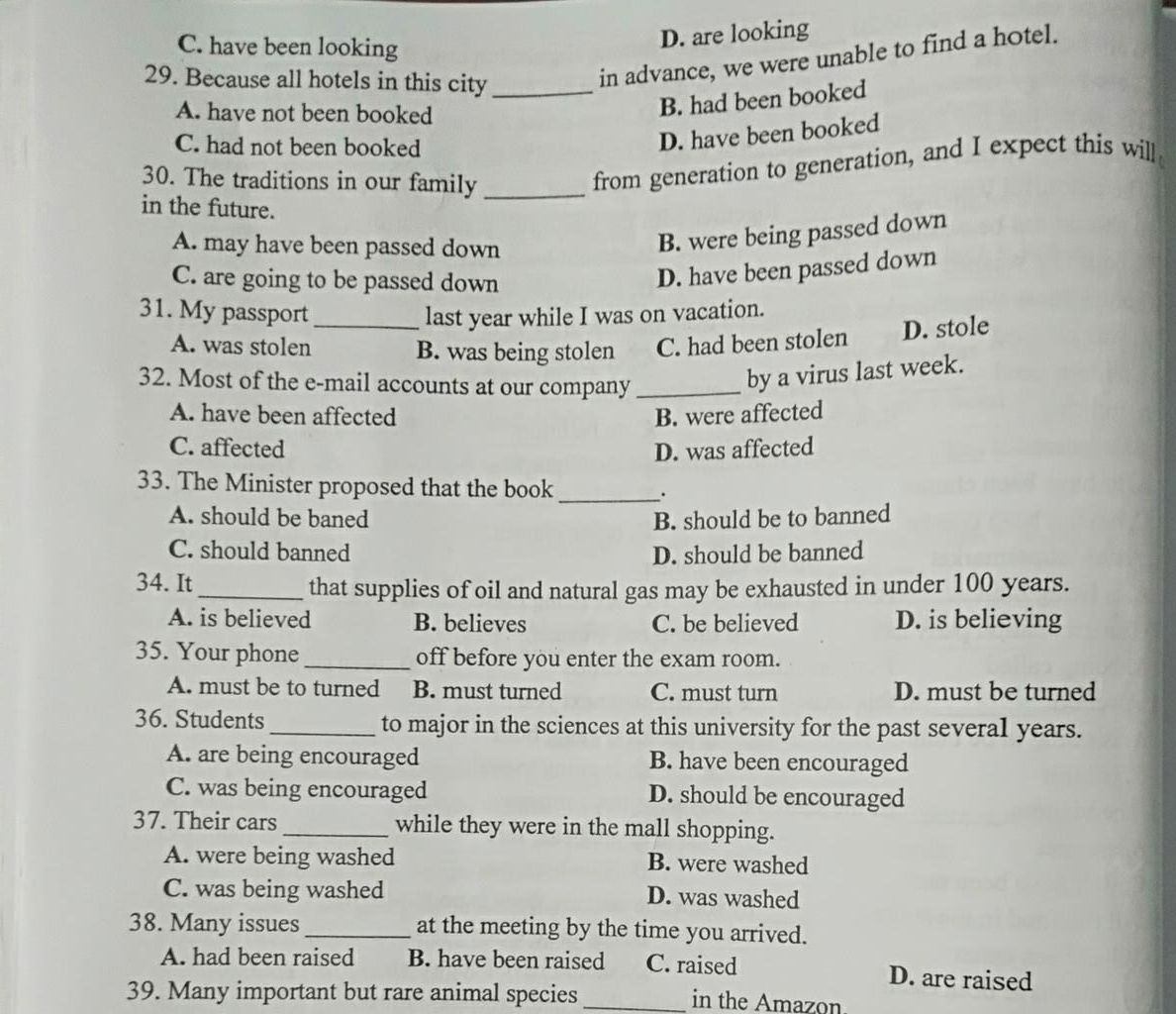 29. B (QKHT -> hành động xảy ra trước hành động khác trong quá khứ)