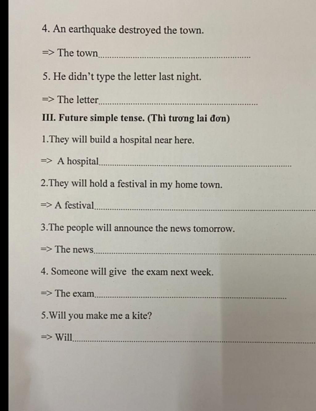 `4,` The town was destroyed by an earthquake ( câu bj động thì QKĐ )