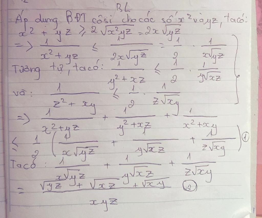 Từ `(1),(2)=>1/(x^{2}+yz)+1/(y^{2}+zx)+1/(z^{2}+xy)<=1/2(1/(xy)+1/(yz)+1/(zx))`