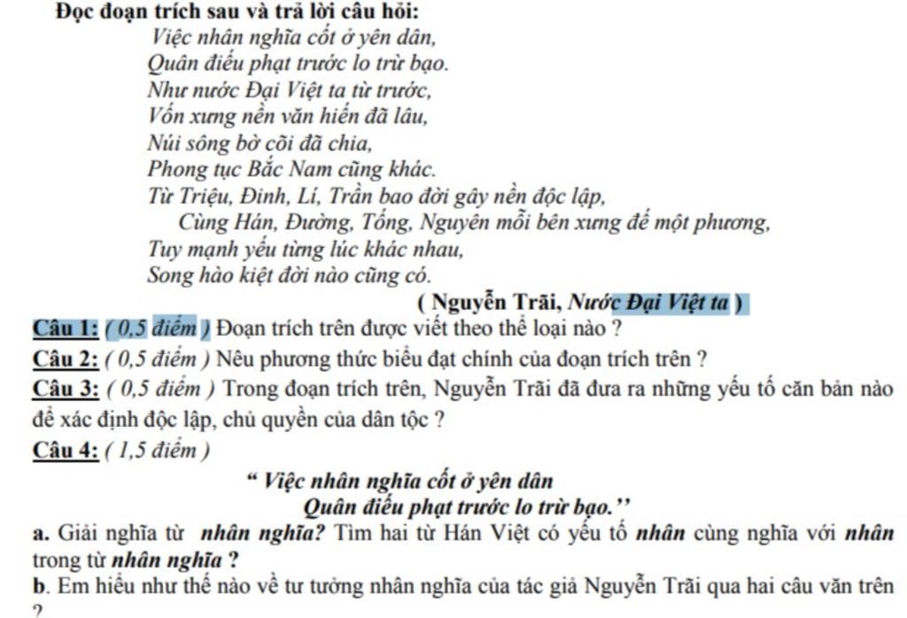 +, Nghĩa của từ "nhân nghĩa" : ư tưởng nhân nghĩa thể hiện ý thức độc lập vì dân trừ bạovaf những quan niệm toàn diện về sự tồn tại bất khả xâm phạm