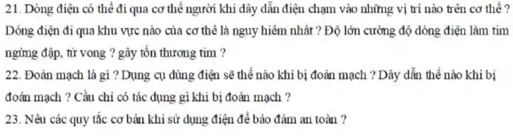 21, Dòng điện có thể đi qua cơ thể người khi dây dẫn điện chạm vào bất kì những vị trí nào trên cơ thể.