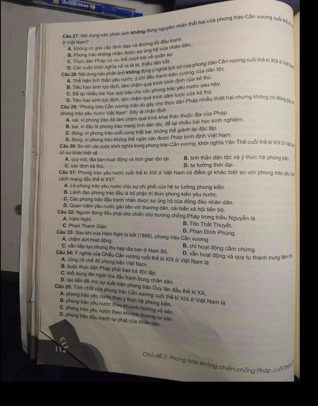 Câu 27: Nội dung nào phản ánh không đúng nguyên nhân thất bại của phong trào Cần vương cuối the k