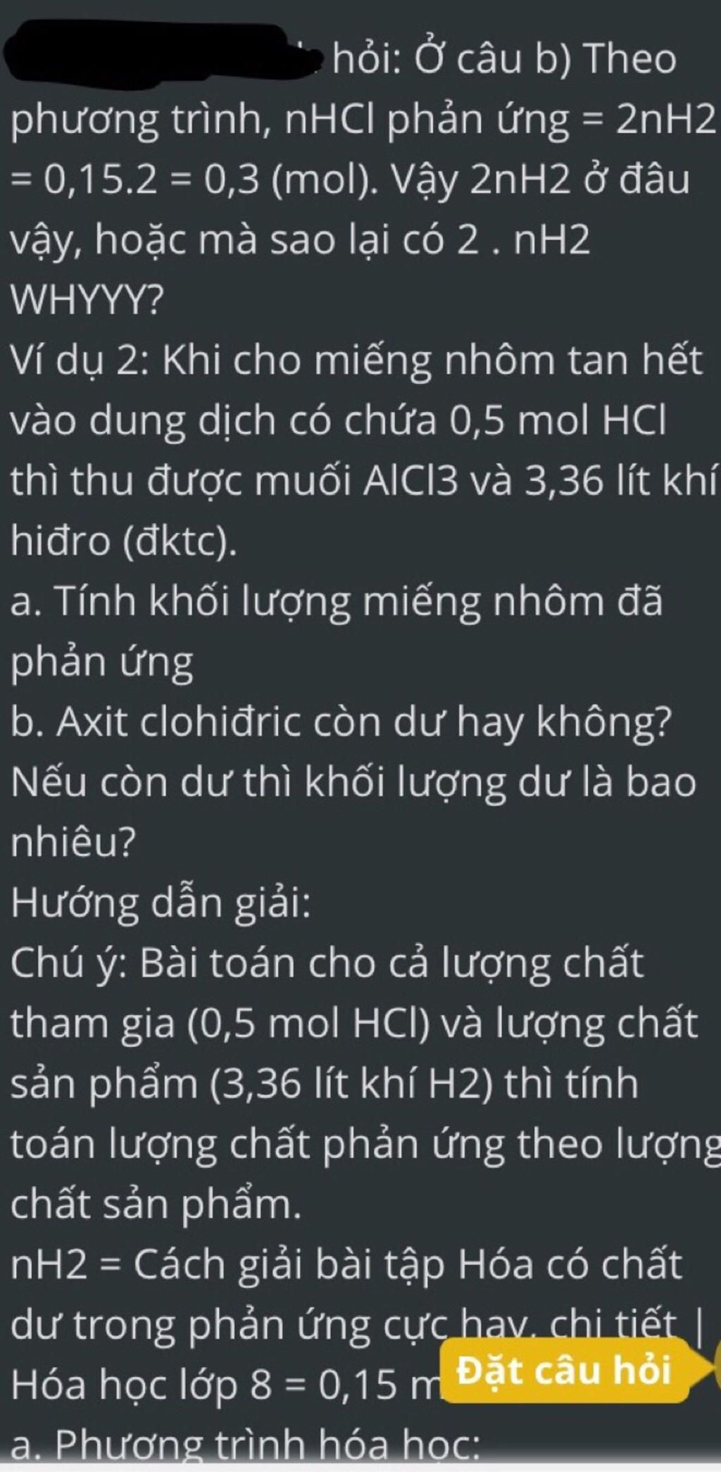 Ở trên phương trình ấy bạn, bạn thấy cái hệ số cân bằng của H2 là 3, của HCl bằng 6 không? Người ta coi là là tỉ lệ số mol đấy. 6/3=2=>nHCl=2nH2