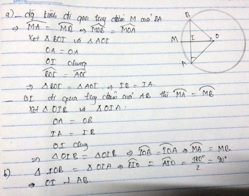 vì I là điểm nằm chính giữa cung AB suy ra cung IA= cung IB . suy ra IA = IB. suy ra điểm I thuộc đường trung trực của AB. mà OA =OB =R suy rs điểm O thuộc đường trung trực của AB .suy ra OI là đường trung trực của AB . suy ra OI vông góc vs AB và AH =HB suy ra OI ĐI QUA TRUNG ĐIỂM CỦA AB . SUY RA IK ĐI QUA TRUNG ĐIỂM CỦA AB