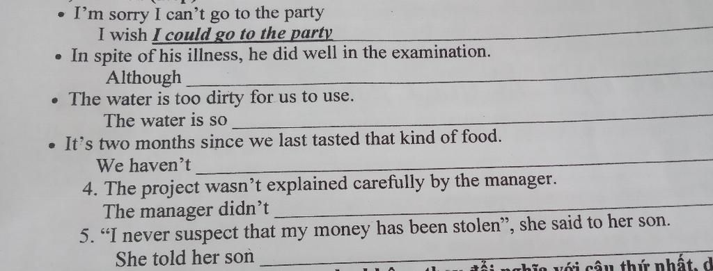 \(\text{1.I wish I could go to the party.}\\\text{2.Although he was ill,he did well in the examination.}\\\text{3.The water is so dirty that we can't use it.}\\\text{4.We haven't tatsed that kind of food for two months.}\\\text{5.The manager didn't explain the project carefully.(chuyển đổi câu bị động->chủ động)}\\\text{6.She told her son that she never suspected that her money had been stolen.}\\\text{(bạn xem lại lý thuyết phần câu gián tiếp nha)}\\\text{Giải thích:}\\\text{1.Câu ước không có thật ở HT:S+wish+S+were/v-ed.}\\\text{2.In spite of/Despite+V-ing=Although+S+V:mặc dù...}\\\text{3.S+to be+too+adj(+for+O)+to V-inf=S+to be+so+adj+that+clause.}\\\text{4.It's+time+since+S(+last)+V-ed=S+haven't/hasn't+P2+for/since+time.}\)