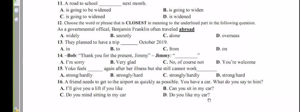 `12. D` (abroad = overseas: nước ngoài)