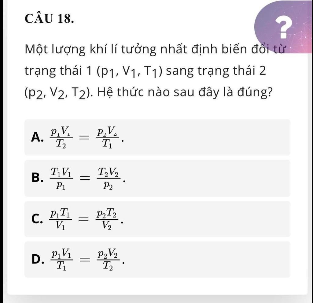 $\dfrac{{{p_1}{V_1}}}{{{T_1}}} = \dfrac{{{p_2}{V_2}}}{{{T_2}}} \rightarrow D$