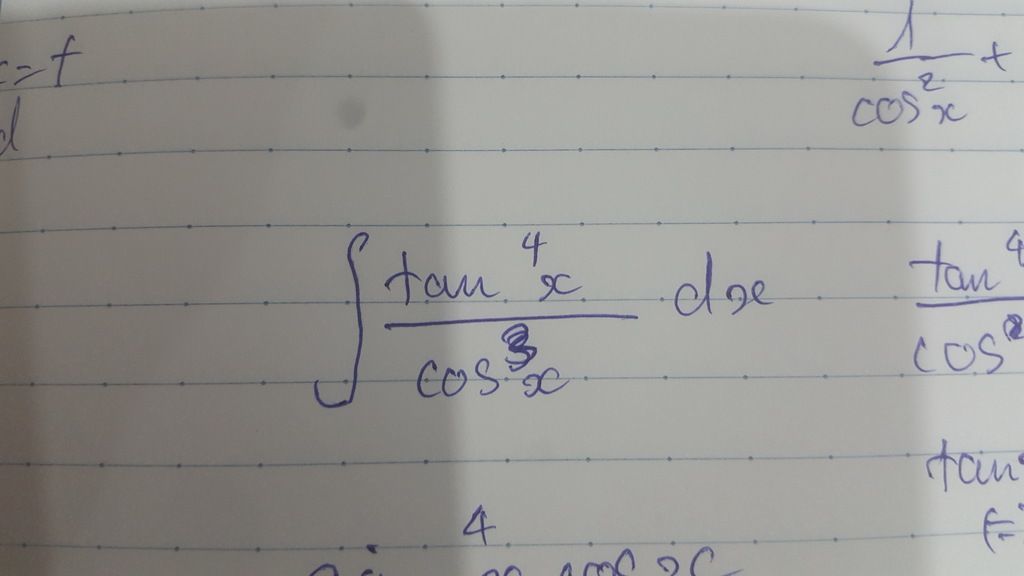 $\begin{array}{l}\quad \displaystyle\int\dfrac{\tan^4x}{\cos^3x}dx\\ = \displaystyle\int \tan^4x.\sec^xdx\qquad với\,\,\sec x = \dfrac{1}{\cos x}\\ = \displaystyle\int (\sec^2x - 1)^2\sec^3xdx\\ = \displaystyle\int(\sec^7x - 2\sec^5x + \sec^3x)dx\\ = \displaystyle\int\sec^7xdx - 2\displaystyle\int\sec^5xdx + \displaystyle\int\sec^3xdx\\ = \left(\dfrac{\sin x\sec^6x}{6} + \dfrac{5}{6}\displaystyle\int\sec^5xdx \right) -2\left(\dfrac{\sin x\sec^4x}{4} + \dfrac{3}{4}\displaystyle\int\sec^3xdx \right) + \left(\dfrac{\sin x\sec^2x}{2} + \dfrac{1}{2}\displaystyle\int\sec xdx \right)\\ = \dfrac{1}{6}\tan x\sec^5x - \dfrac{7}{24}\tan x\sec^3x+\dfrac{1}{16}\tan x\sec x + \dfrac{1}{16}\displaystyle\int\sec xdx\\ = \dfrac{1}{6}\tan x\sec^5x - \dfrac{7}{24}\tan x\sec^3x+\dfrac{1}{16}\tan x\sec x+ \dfrac{1}{16}\ln|\tan x + \sec x| + C \end{array}$