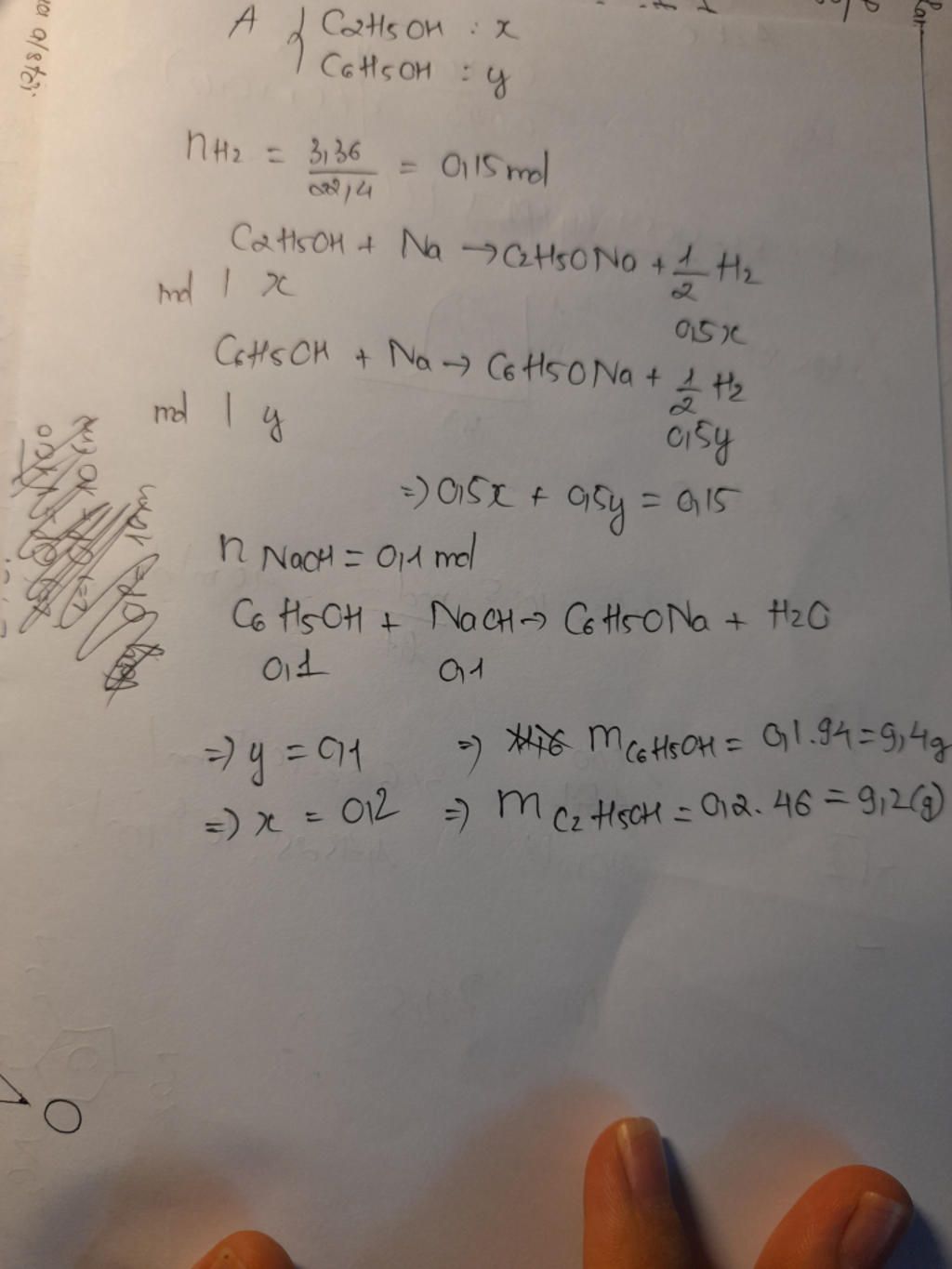 {n_{{H_2}(2)}} = \dfrac{{{n_{{C_6}{H_5}OH}}}}{2} = 0,05mol\\