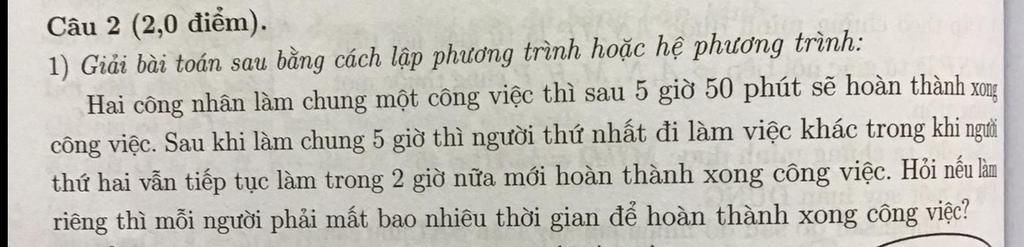 sau khi làm chung 5h thì người thứ nhất làm được 5/x [cv], người thứ 2 làm tiếp trong 2h xong cv thì người 2 làm được 7/y [cv]