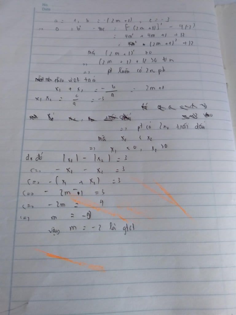 Đoạn đầu $a.c = 1. (-3) = - 3 < 0 => PT$ luôn có 2 nghiệm pb trái dấu, ko cần tính DELTA