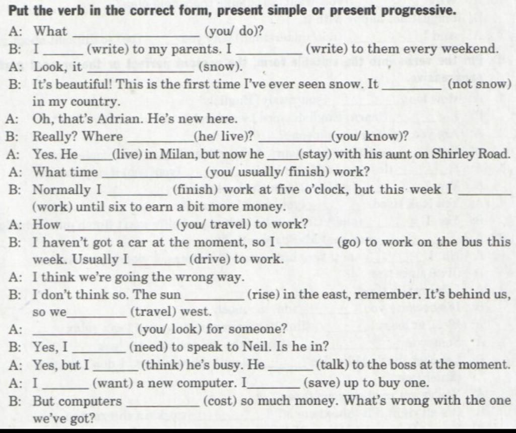 1.are you doing 2.am writing 3.write 4.is snowing 5.isn't snow 6.does he live