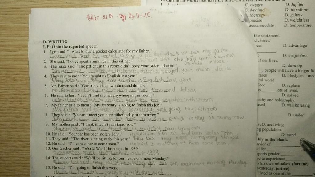 1. Tom said that he wanted to buy a pocket calculator for his father.