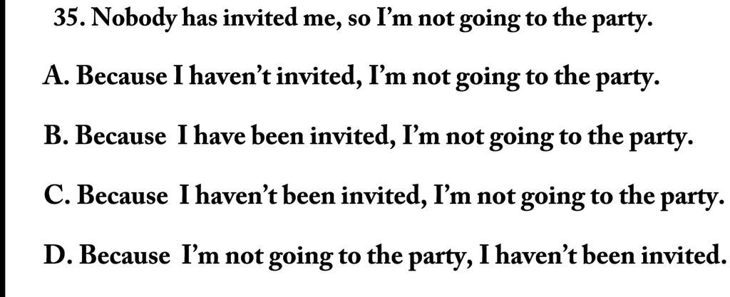35. Nobody has invited me, so I'm not going to the party.