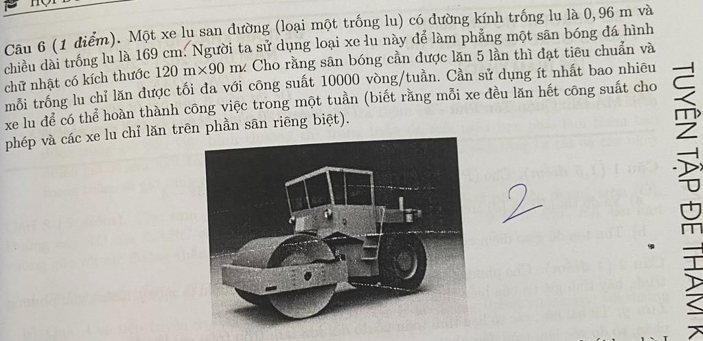 vậy số chiếc xe lu cần dùng để lăn hết trong 1 tuần là: là 2chiec