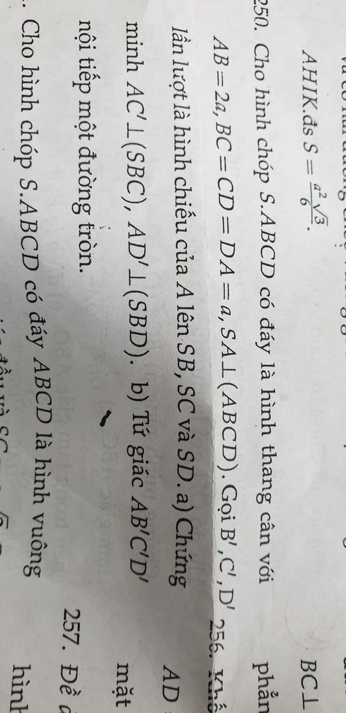 Gọi O là trung điểm AB ⇒ OA = OB = a ⇒ OA//=CD ⇒ OADC là hình bình hành mà OA = AD = DC = a ⇒ OADC là hình thoi ⇒ OC = AD = a = OA = OB ⇒ O là tâm đường tròn ngoại tiếp ΔABC ⇒ ∠ACB = 90o ⇔ AC⊥BC (1)