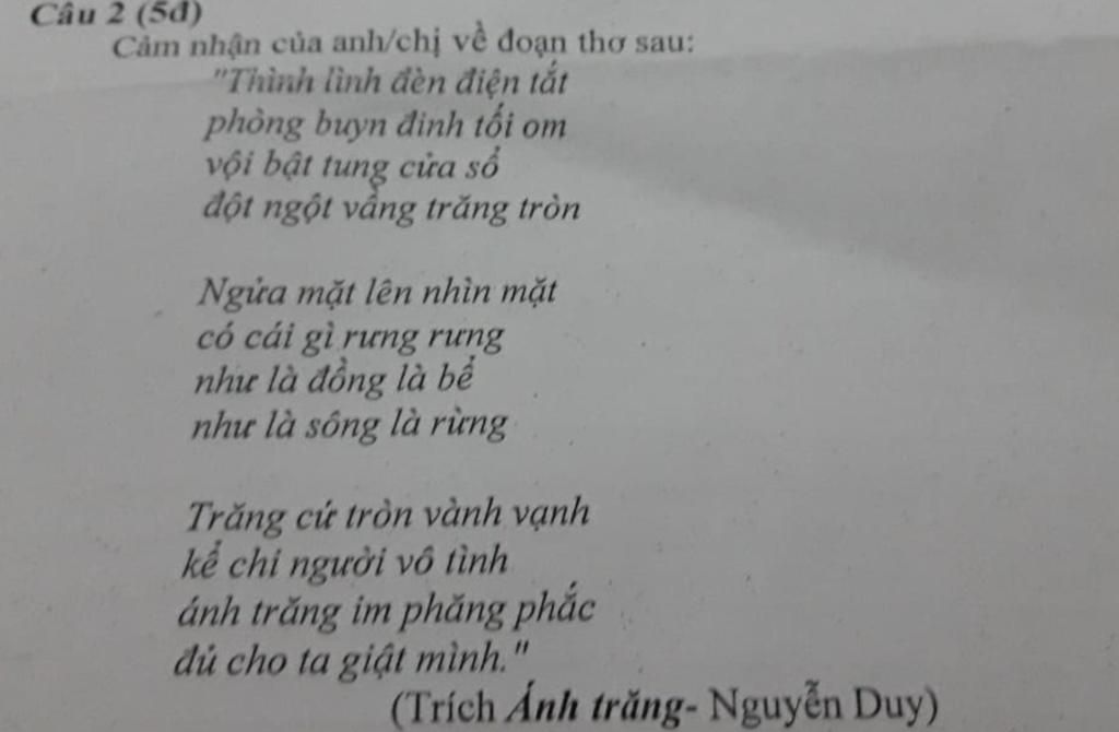 Ánh trăng, bài thơ được ông viết năm 1978, những năm đầu đất nước thống nhất. Mạch cảm xúc bài thơ đầy trữ tình nói về quá khứ - hiện tại. Ánh trăng một chủ đề vô cùng độc đáo , và quen thuộc trong thi ca, là nguồn cảm hứng vô tận cho bao nhiêu nhà thơ. Ánh trăng ở đây với Nguyễn Duy không chỉ là chất thơ mà còn được biểu đạt một hàm nghĩa mới, mang dấu ấn của tình cảm đầy sâu lắng thời hiện đại. " Ánh trăng" giản dị như một niềm ân hận trong tâm sự giấu kín của nhà thơ.