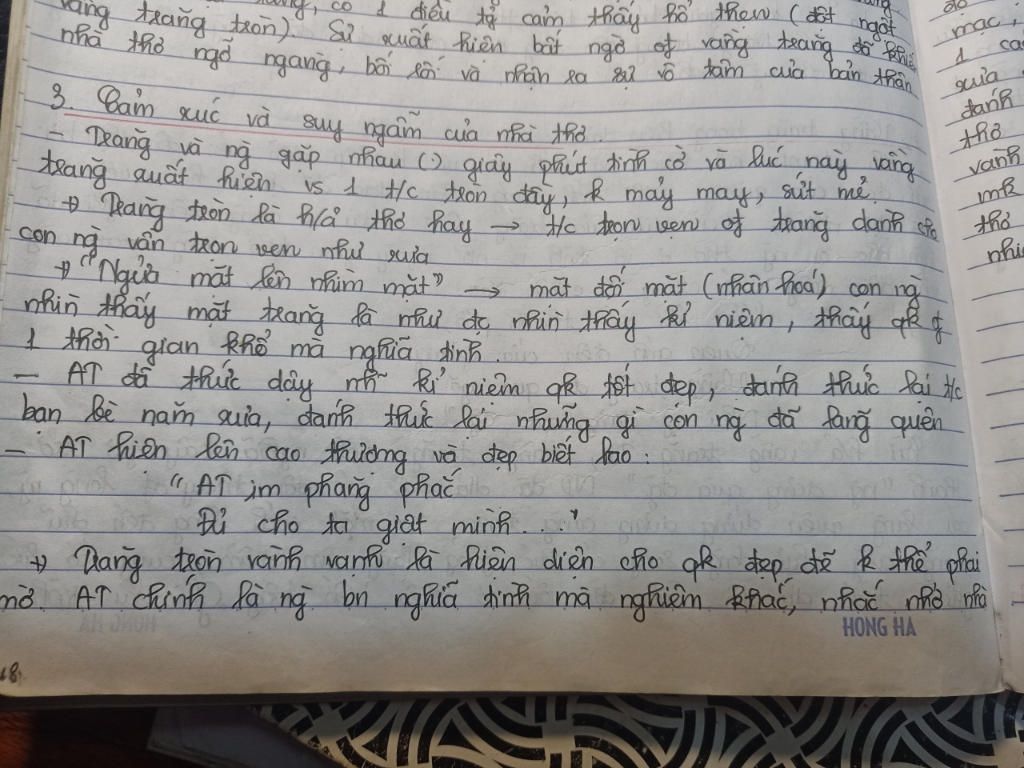 Khổ thơ thứ năm là hình tượng vầng trăng và cảm xúc, suy ngẫm của nhà thơ. Còn đến khổ thơ thứ sáu là những suy ngẫm và triết lí nhân sinh của nhà thơ qua hình tượng trăng: