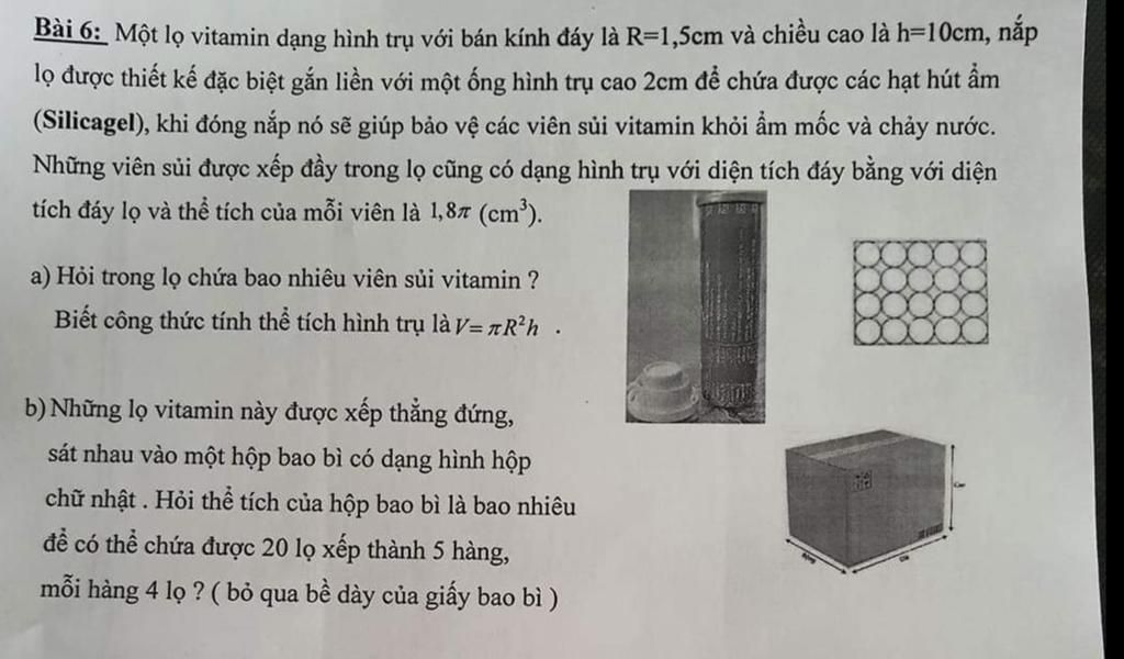 Vậy thể tích của hộp bao bì HHCN ≥450$\pi$ để có thể chứa đc 20 lọ xếp thành 5 lọ hàng, mỗi hàng 4 lọ.