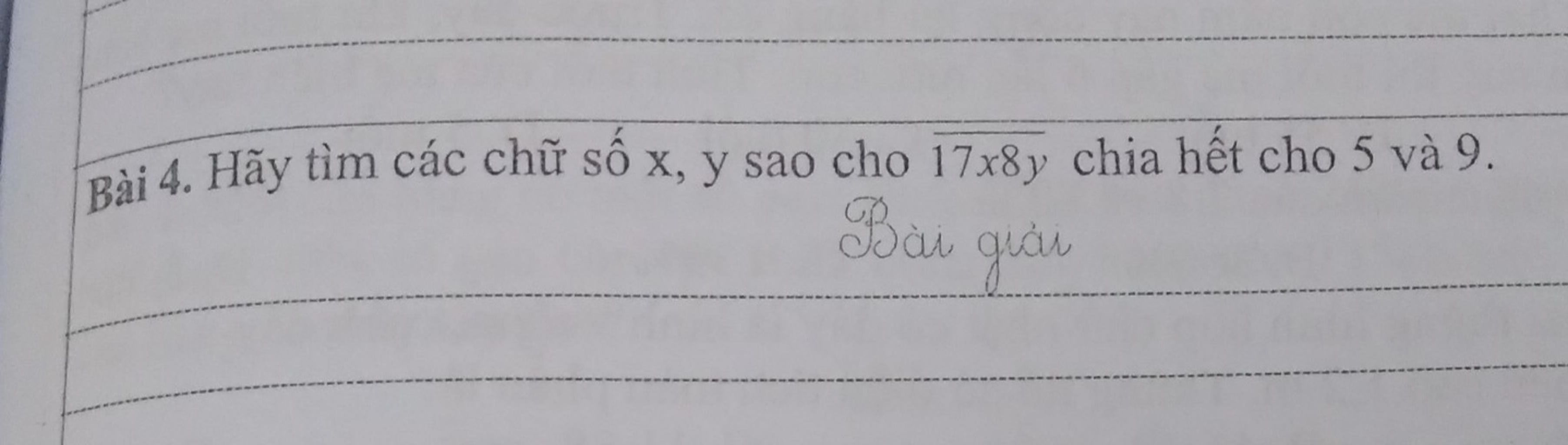 Để `overline(17x8y) \ vdots 5` thì `y=0` hoặc `y=5`