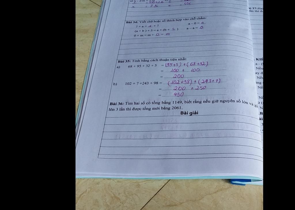 Tìm hai số có tổng bằng `1149`, biết rằng nếu giữ nguyên số lớn và số bé gấp lên `3` lần thì được tổng mới bằng `2061`