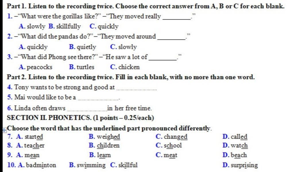 11. They enjoy ________ the kites in their free time. D. surprising A. fly B. flying C. to fly 12. You should ________ your hands before meals. D. flied A. to wash B. washing C. wash 13. Would you like ________ dinner with me tonight? D. washes A. have B. to have C. having 14. I don’t like beef. My mother doesn’t, ________. D. has A. so B. too C. either 15. Nam was scared________ seeing the dentist. D. neither A. of B. to C. for 16. He is a ________soccer player. He plays soccer very well. D. in A. well B. bad C. good 17. Mr. Ba is a (an) ________. He works hard on his farm. D. badly A. farmer B. engineer C. teacher 18. Jack Cousteau invented a deep-sea diving ________ in the 1940s. D. doctor A. equipment B. camera C. scuba D. vessel Rút gọn11. They enjoy ________ the kites in their free time. D. surprising A. fly B. flying C. to fly 12. You should ________ your hands before meals. D. flied A. to wash B. washing C. wash 13. Would you like ________ dinner with me tonight? ... xem thêm