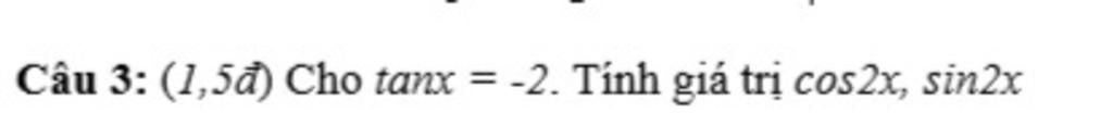 $\begin{array}{l} \sin 2x = \dfrac{{2t}}{{1 + {t^2}}},\cos 2x = \dfrac{{1 - {t^2}}}{{1 + {t^2}}}\\ \Rightarrow \left\{ \begin{array}{l} \sin 2x = \dfrac{{2\left( { - 2} \right)}}{{1 + {{\left( { - 2} \right)}^2}}} = - \dfrac{4}{5}\\ \cos 2x = \dfrac{{1 - {{\left( { - 2} \right)}^2}}}{{1 + {{\left( { - 2} \right)}^2}}} = - \dfrac{3}{5} \end{array} \right. \end{array}$